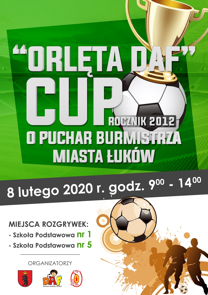 ŁKS „Orlęta Łuków” i Dziecięca Akademia Futbolu zapraszają miłośników sportu na turniej piłki nożnej o Puchar Burmistrza Miasta Łuków. Rozgrywki rocznika 2012 zaplanowano w najbliższą sobotę 8 lutego w Zespole Szkolno-Przedszkolnym oraz Szkole Podstawowej nr 5 w Łukowie.